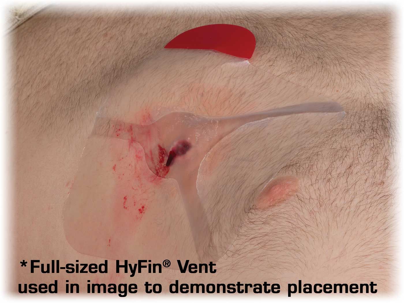 The HyFin® Vent Compact Chest Seal Twin Pack provides users with two vented chest seals in a compact packaging designed for the prevention, management and treatment of an open and/or tension pneumothorax potentially caused by a penetrating chest trauma. The cutting-edge design of these chest seals incorporate 3-vented channels designed to allow air to escape the chest cavity during exhalation but prevent airflow from entering through the injury site during inhalation. Each HyFin® Vent Compact Chest Seal is made with advanced hydrogel technology designed to provide a superior adhesion in adverse conditions or austere environments where the casualty may be covered in blood, sweat, body hair, or other environmental contaminants.