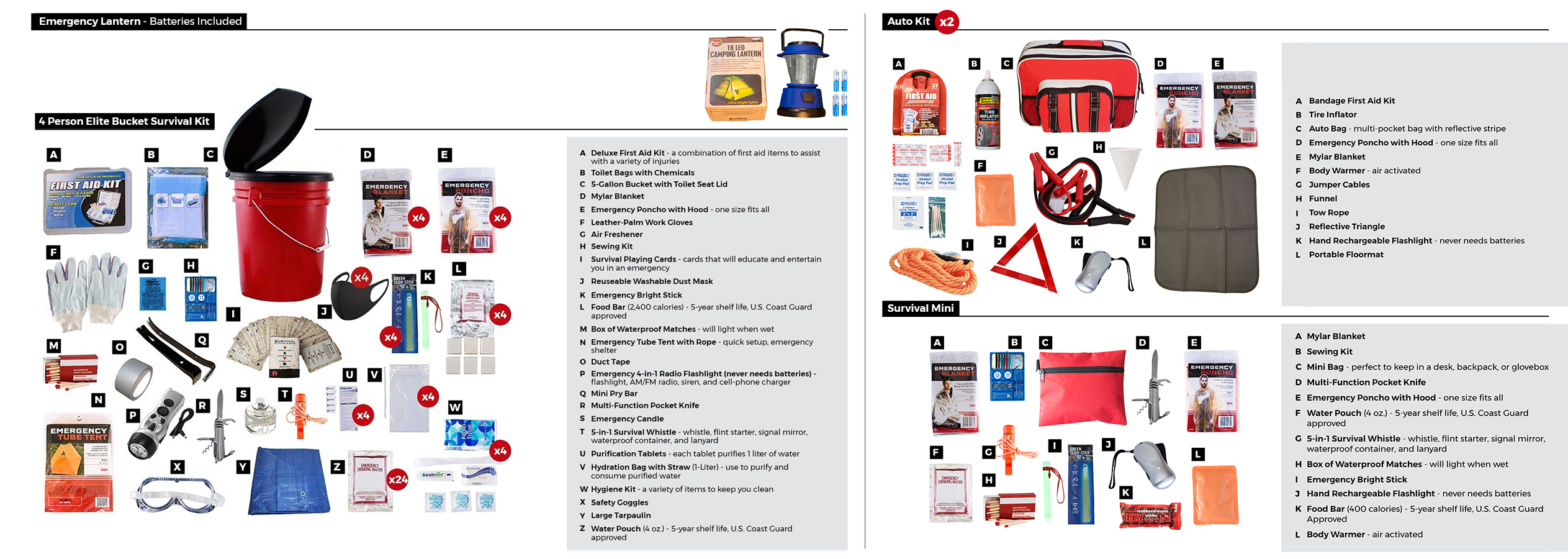 This Package is designed to fill all of the preparedness needs of 4 individuals by providing emergency supplies for the home, car, and one other location.